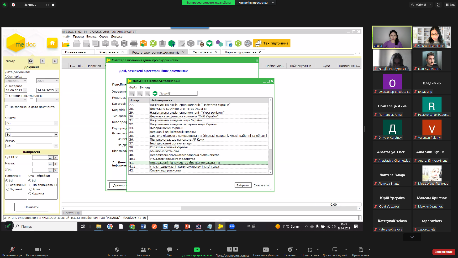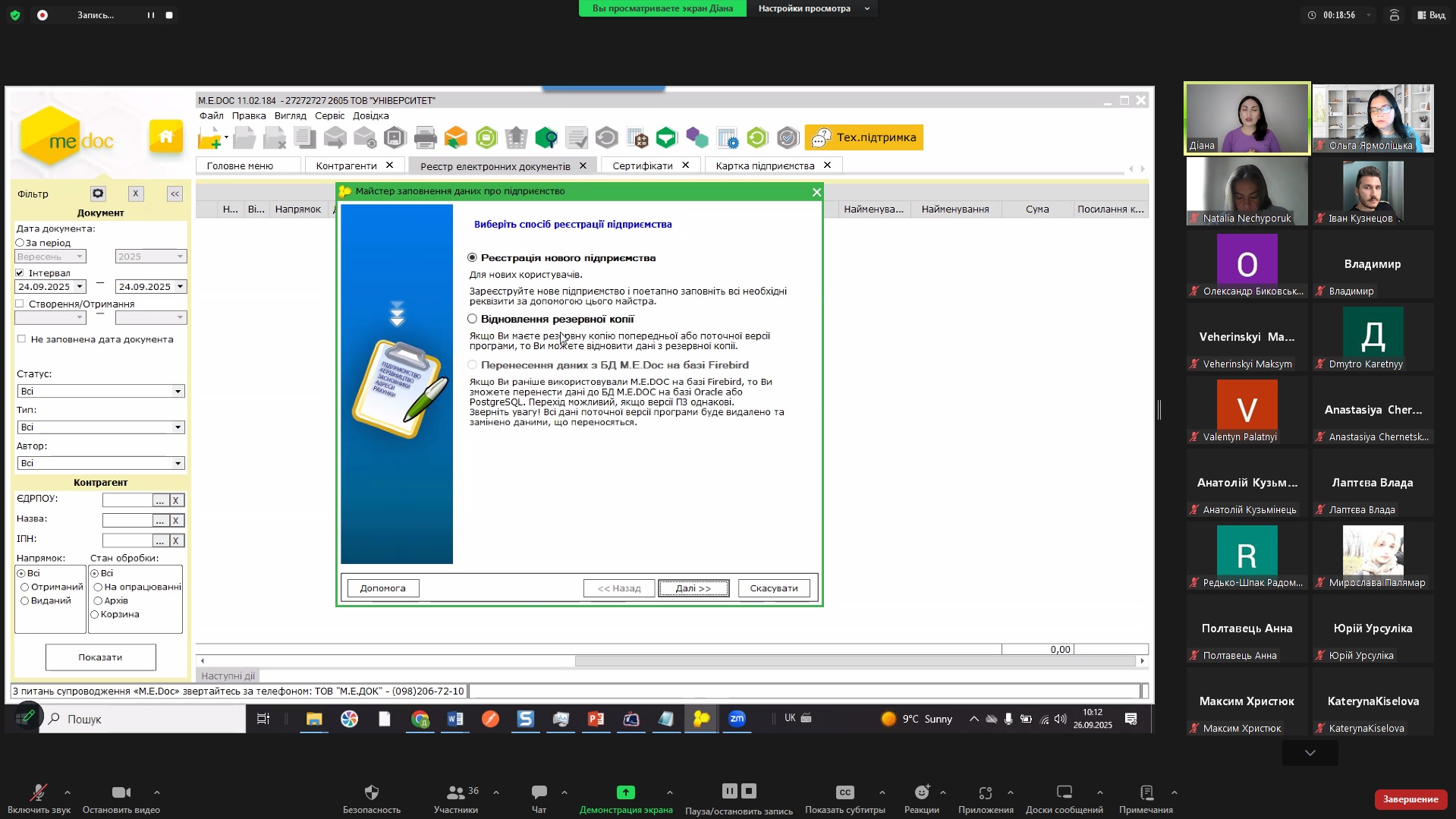 26 вересня 2025 року розпочався цикл лекцій та практичних занять від партнера кафедри обліку, аудиту та оподаткування ТОВ “М.Е.ДОК”. До проведення практичних занять було запрошено представника М.Е.ДОК Діану Агабабян. Модератором виступила к.е.н., доцент кафедри обліку, аудиту та оподаткування Ольга Ярмоліцька. Під час занять здобувачі першого (бакалаврського) та другого (магістерського) рівнів вищої освіти в рамках вивчення вибіркових компонент ознайомилися з програмним забезпеченням M.E.Doc. Використовуючи функціонал програмного забезпечення почали виконувати практичні завдання, реєструвати підприємство. Завдяки такому підходу здобувачі отримують не лише грунтовні теоретичні знання, а й практичну компетентність, яка відповідає очікуванням сучасного бізнесу й робить їх затребуваними фахівцями з обліку, аудиту та оподаткування.
