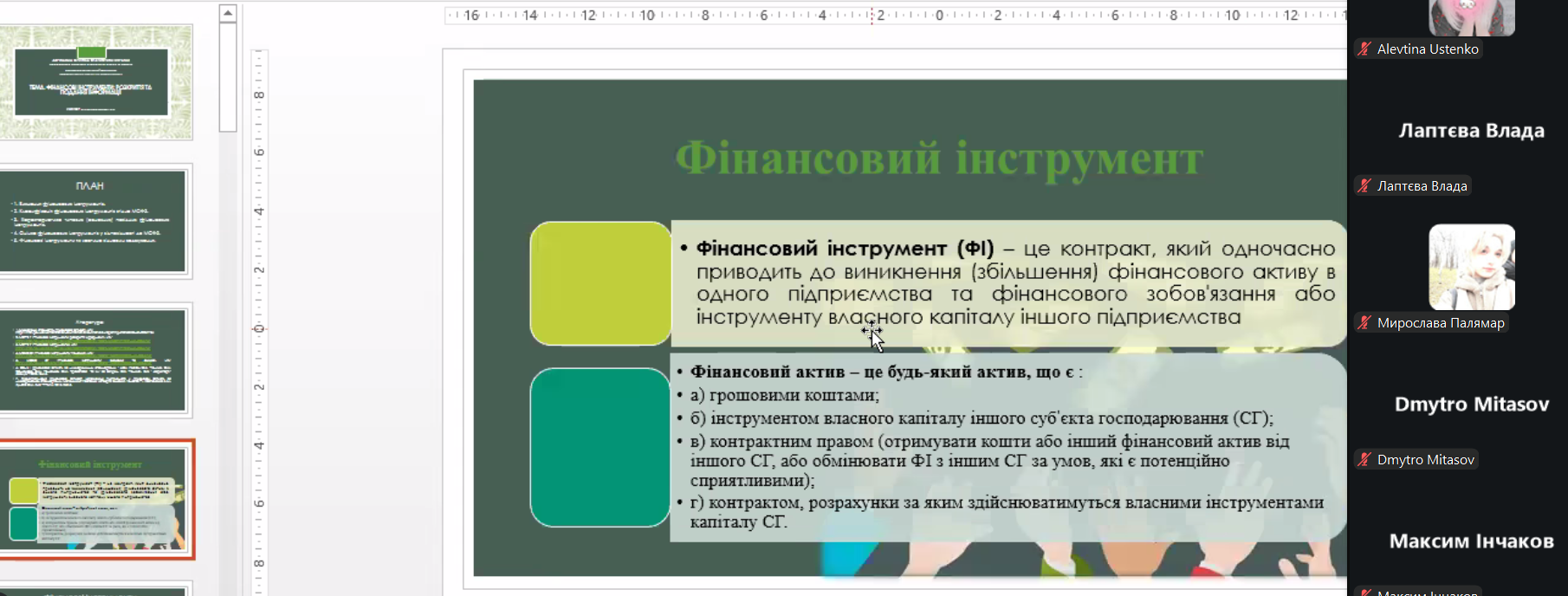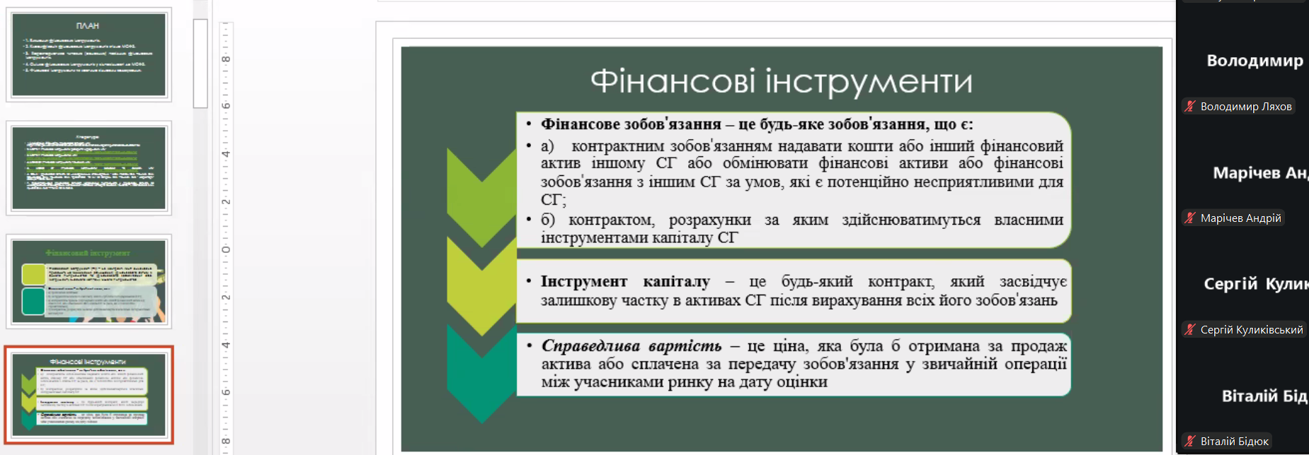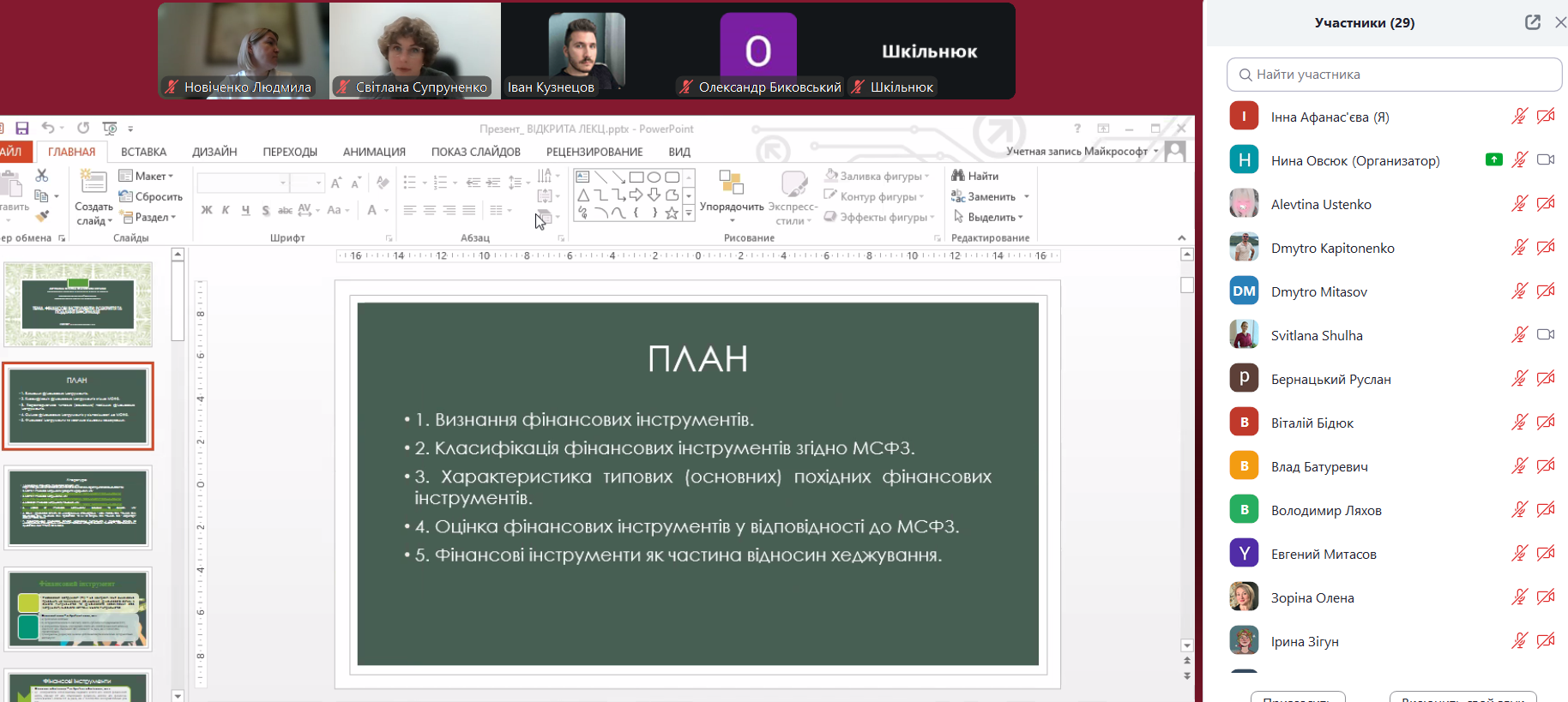 05.11.2025 р. відбулася відкрита лекція доктора економічних наук, професора кафедри обліку, аудиту та оподаткування Овсюк Ніни Василівни з дисципліни «Міжнародні стандарти фінансової звітності» для здобувачів 4 курсу ОПП «Облік, аудит та оподаткування» на тему «Фінансові інструменти: розкриття та подання інформації». Лекція була логічно побудована, структура чітка, під час заняття були розглянуті всі питання зазначені у лекційному плані. Протягом лекції були охарактеризовані фінансові інструменти, зокрема визначені типи похідних фінансових інструментів: форвардні і ф’ючерсні контракти, опціони, «своп» й відмінності між ними. Також було проаналізовано фінансові інструменти як частину відносин хеджування і наведено приклади використання суб’єктом господарювання хеджування та страхування у випадку наявності різних варіантів розвитку подій в умовах ринкової економіки.
