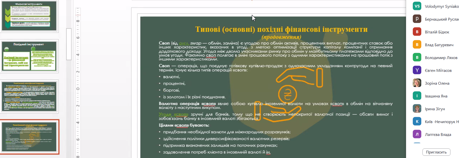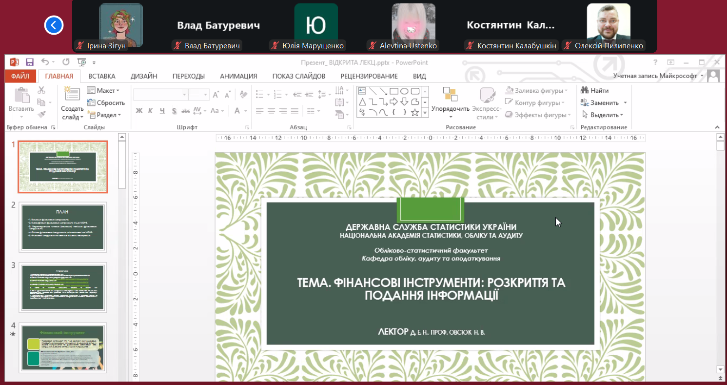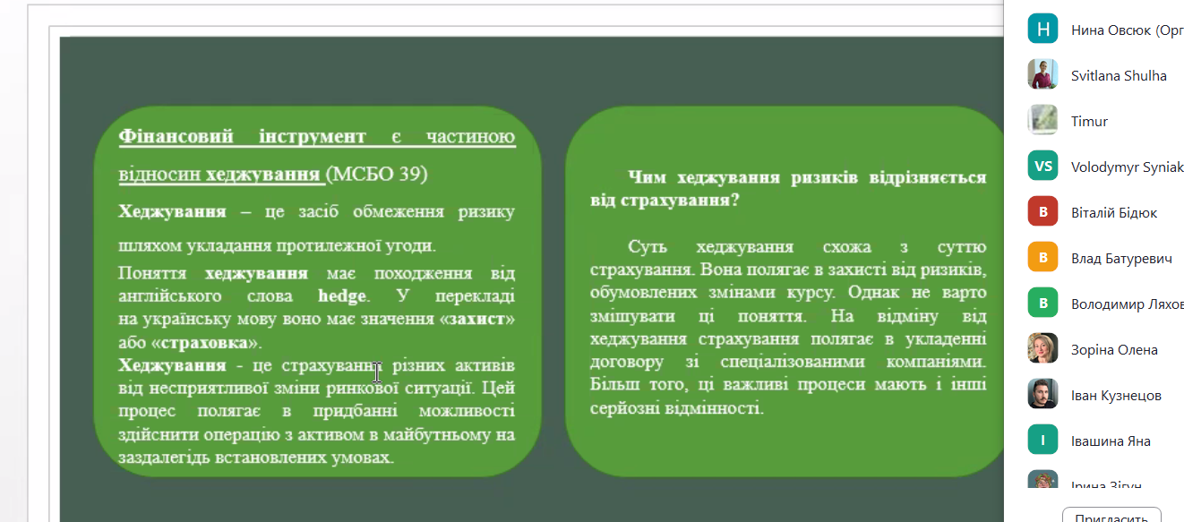 05.11.2025 р. відбулася відкрита лекція доктора економічних наук, професора кафедри обліку, аудиту та оподаткування Овсюк Ніни Василівни з дисципліни «Міжнародні стандарти фінансової звітності» для здобувачів 4 курсу ОПП «Облік, аудит та оподаткування» на тему «Фінансові інструменти: розкриття та подання інформації». Лекція була логічно побудована, структура чітка, під час заняття були розглянуті всі питання зазначені у лекційному плані. Протягом лекції були охарактеризовані фінансові інструменти, зокрема визначені типи похідних фінансових інструментів: форвардні і ф’ючерсні контракти, опціони, «своп» й відмінності між ними. Також було проаналізовано фінансові інструменти як частину відносин хеджування і наведено приклади використання суб’єктом господарювання хеджування та страхування у випадку наявності різних варіантів розвитку подій в умовах ринкової економіки.