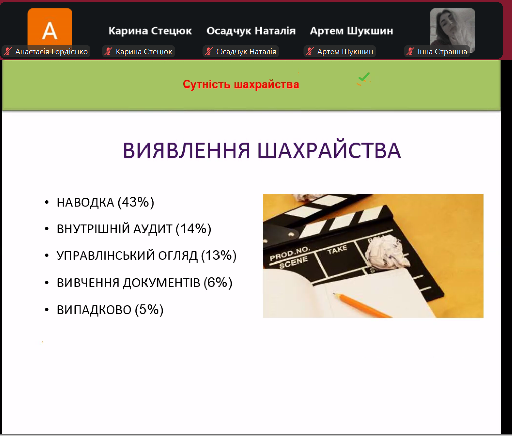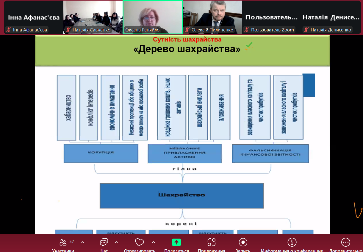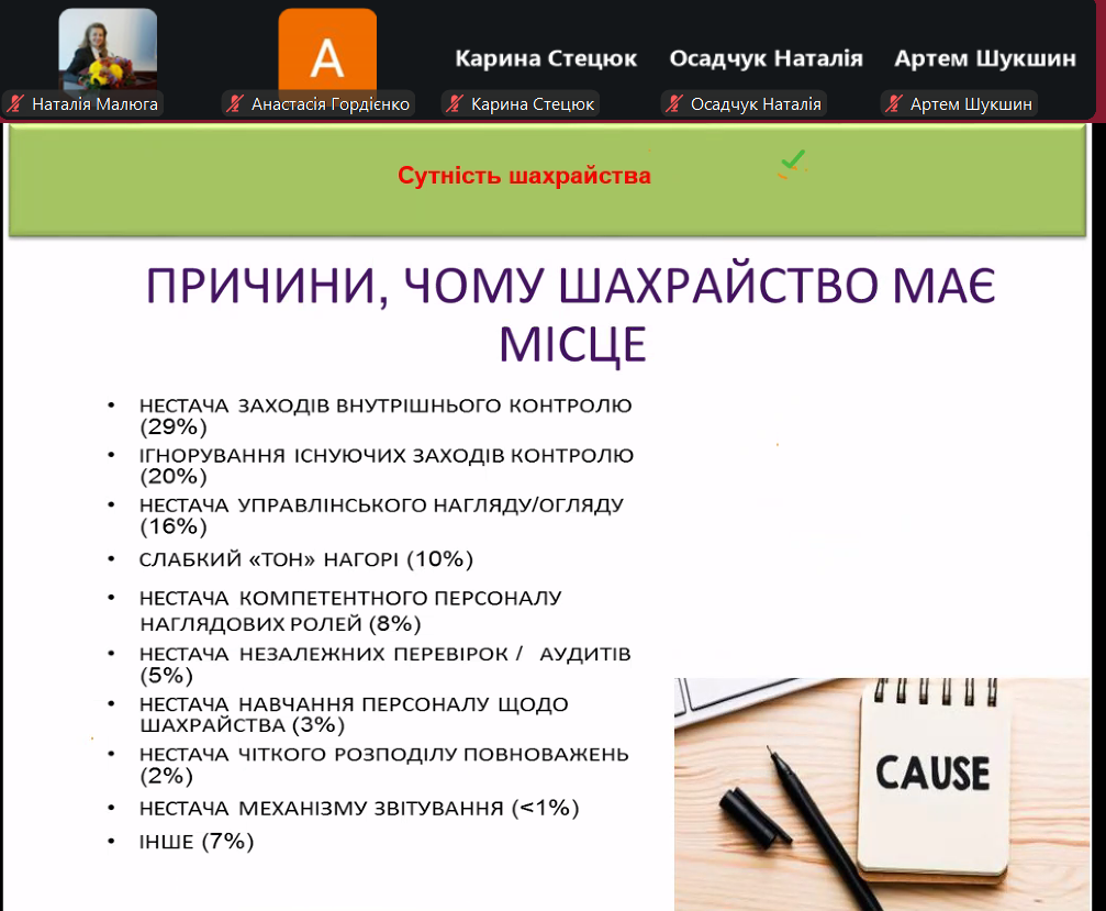 Основні питання гостьової лекції: сутність шахрайства, види шахрайства та індикатори для контролю за ризиками шахрайства. Лекторка навела практичні приклади шахрайських дій, зазначила важливість неформального підходу до проведення аудиту. Щиро дякуємо пані Оксані за цікаву лекцію на актуальну тему, а кафедрі бухгалтерського обліку, оподаткування та аудиту Поліського національного університету – за запрошення та співпрацю!