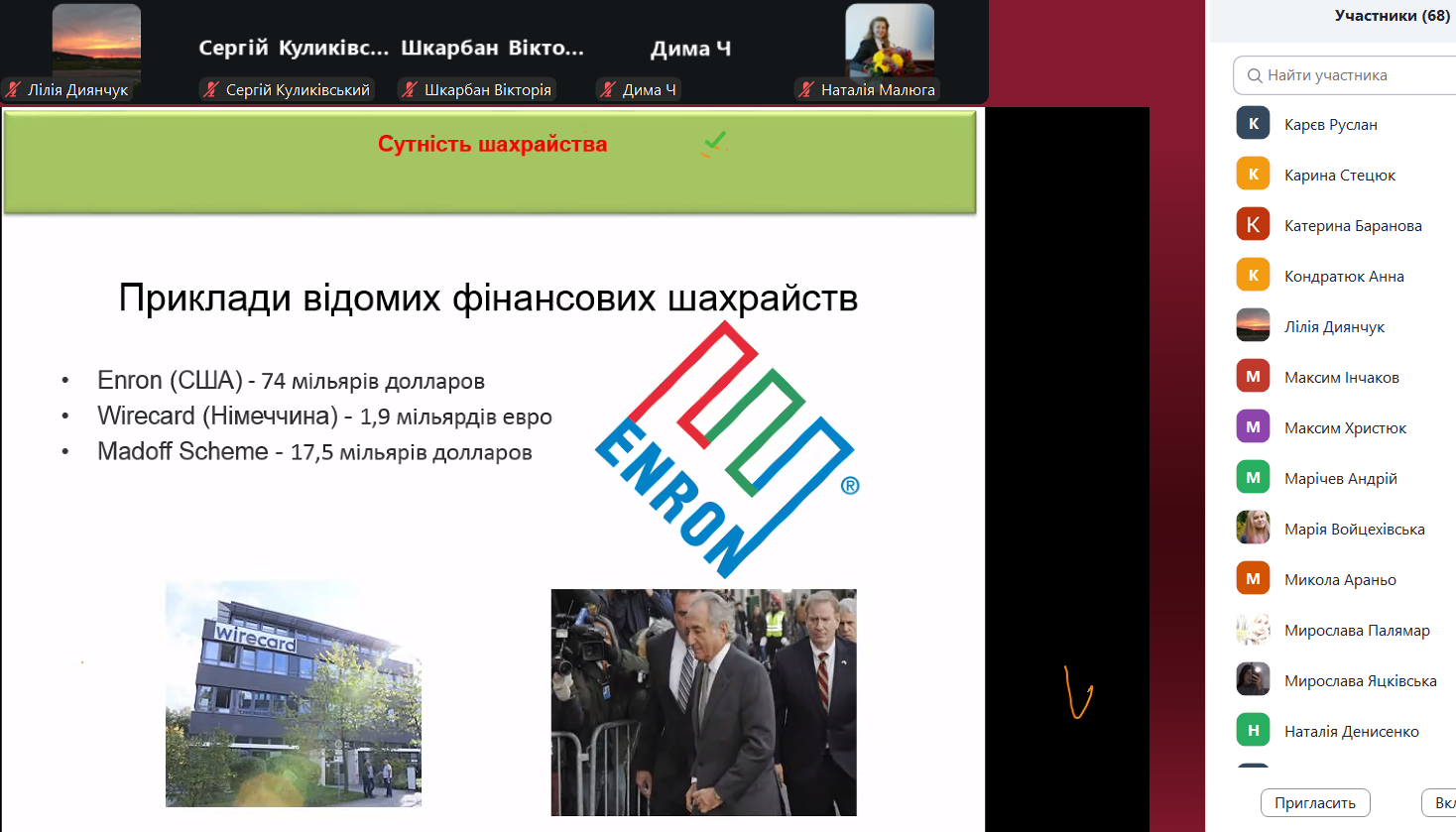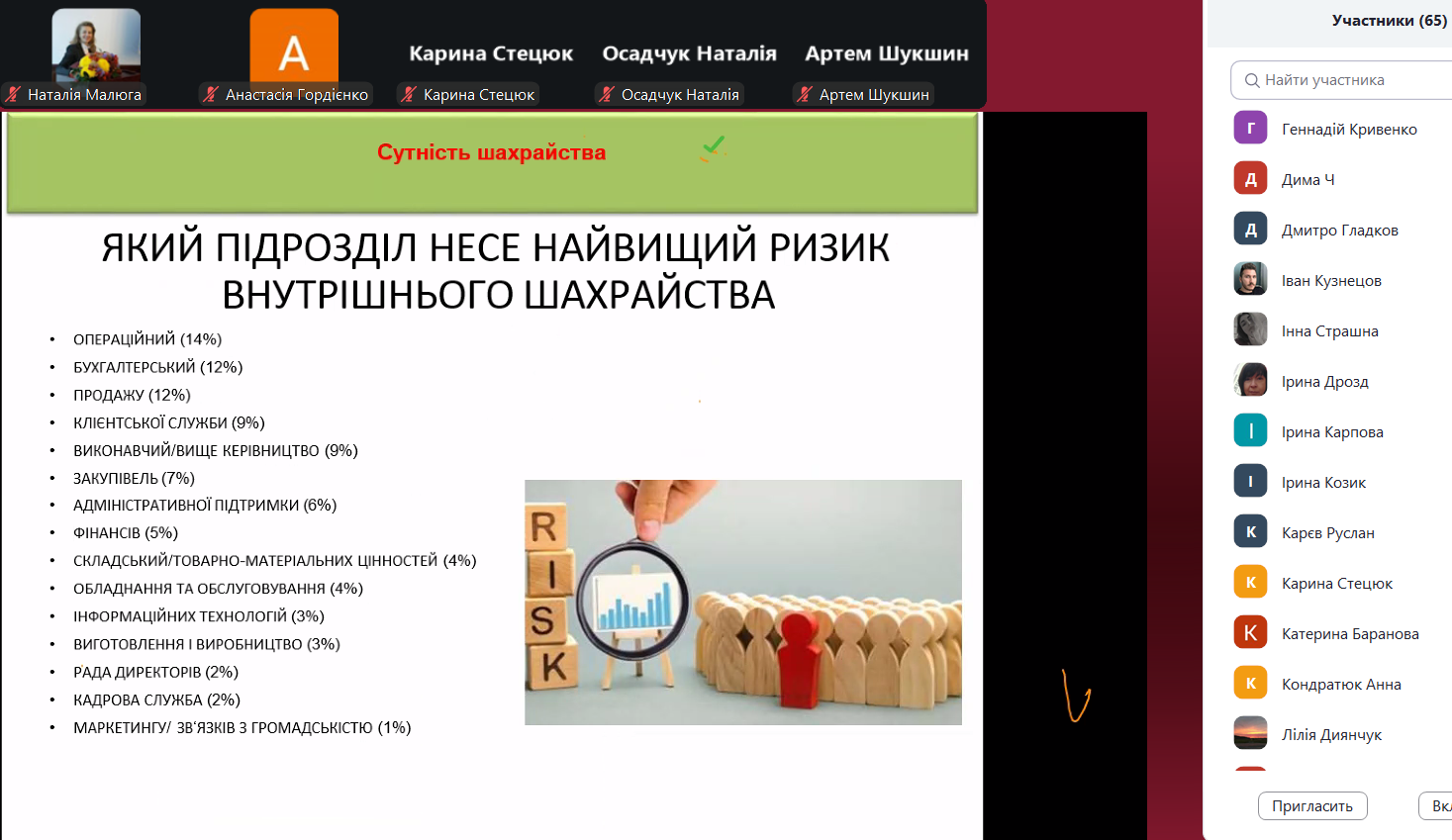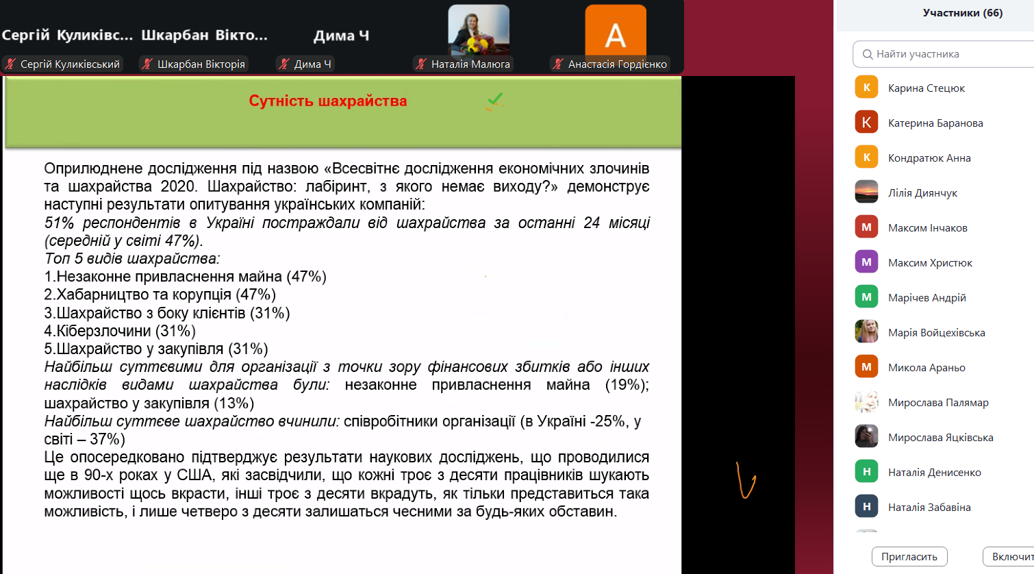 Основні питання гостьової лекції: сутність шахрайства, види шахрайства та індикатори для контролю за ризиками шахрайства. Лекторка навела практичні приклади шахрайських дій, зазначила важливість неформального підходу до проведення аудиту. Щиро дякуємо пані Оксані за цікаву лекцію на актуальну тему, а кафедрі бухгалтерського обліку, оподаткування та аудиту Поліського національного університету – за запрошення та співпрацю!