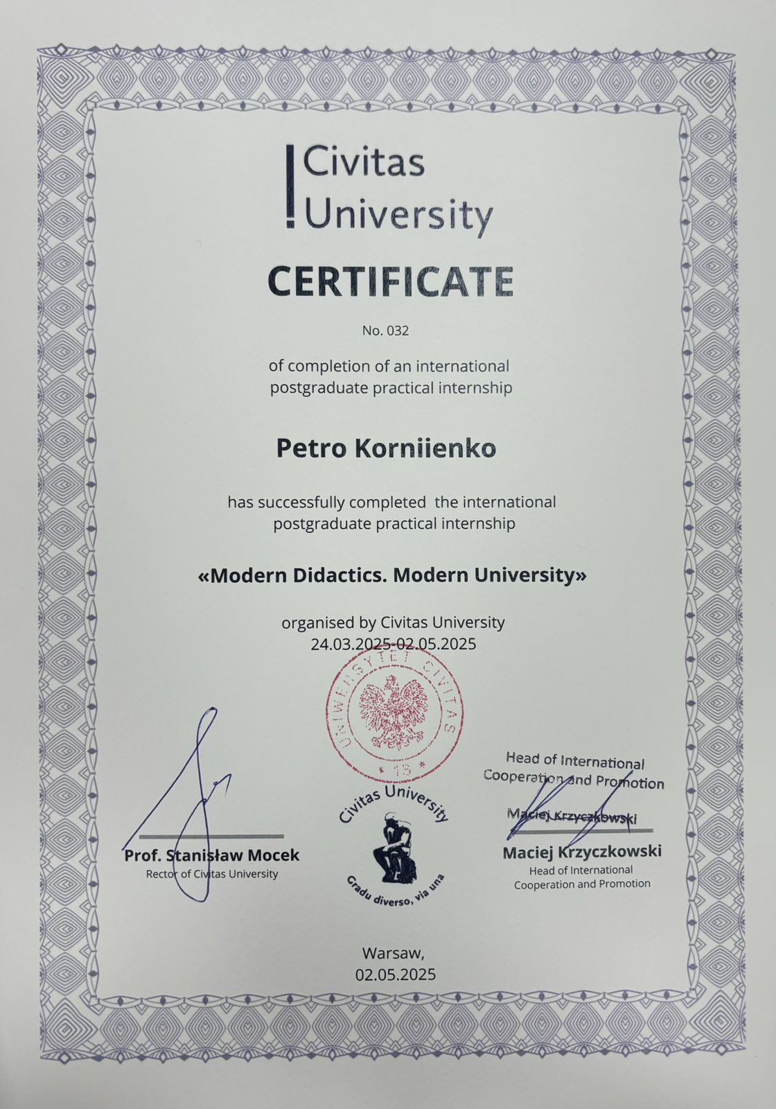 - Civitas University, міжнародна програма підвищення кваліфікації «Сучасні дидактики. Сучасні університети» (Сертифікат № 032 від 02.05.2025 р.);